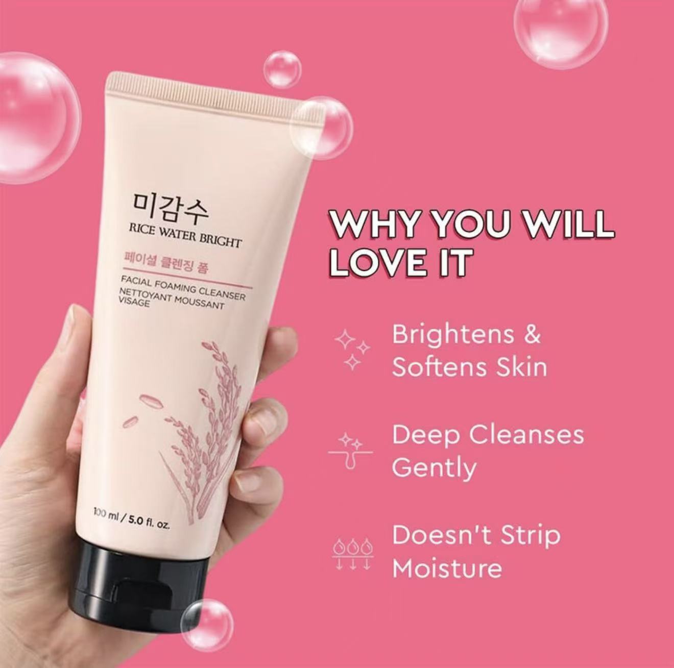 ত্বক পরিষ্কার করার পাশাপাশি উজ্জ্বলতা বাড়ানোর জন্য Rice Water Bright Foaming Cleanser একটি কার্যকর ও মাইল্ড ফেসওয়াশ।